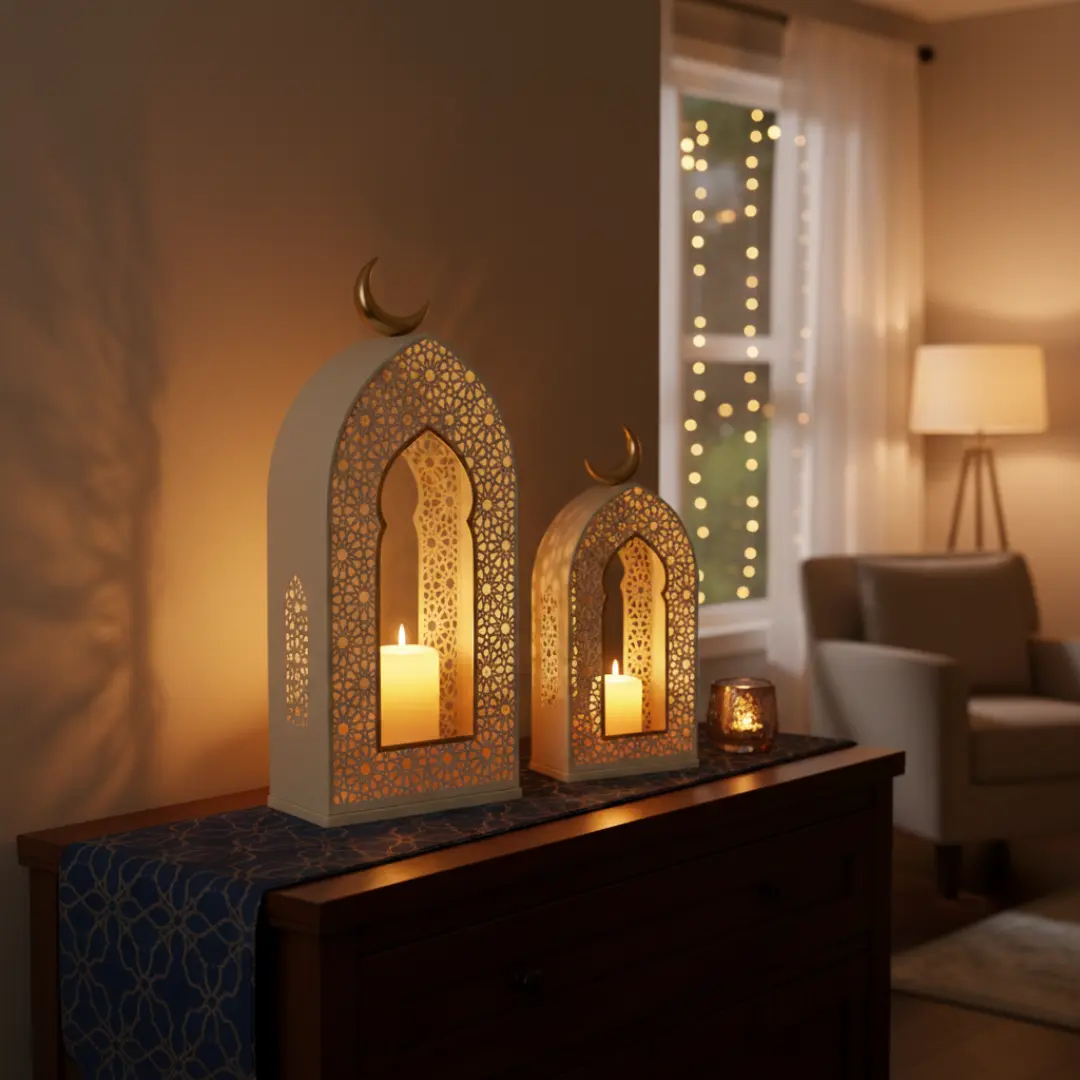 Associez ces lanternes Manar crème & or à des bougies ivoire ou blanches pour renforcer l’élégance de la décoration. Elles s’intègrent parfaitement dans un intérieur clair, bohème ou classique chic.